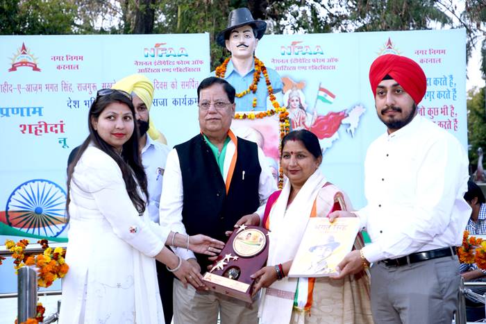 शहीद ए आजम भगत सिंह राजगुरु सुखदेव के 89 वे शहादत दिवस पर आज नेशनल इंटीग्रेटेड फोरम आफ आर्टिस्ट्स एन्ड एक्टिविस्ट्स(निफा) द्वारा नगर निगम करनाल के सहयोग से देश भगति के गीतों के कार्यक्रम प्रणाम शहीदां नु का आयोजन किया गया। कर्ण पार्क मेंशहीद भगत सिंह की प्रतिमा के पास आयोजित देशभक्ति से भरपूर इस अनूठे आयोजन में हाल ही में पाकिस्तान से लड़ते हुए शहीद हुए ढिंगरमाजरा गावँ के जवान शहीद बलजीत सिंह के पिता किशन चंद को नागरिक सम्मान से सम्मानित किया गया।