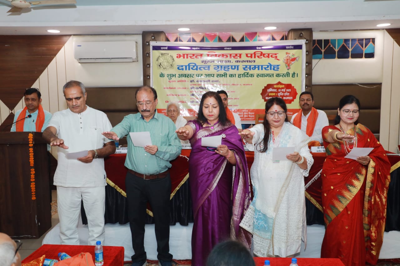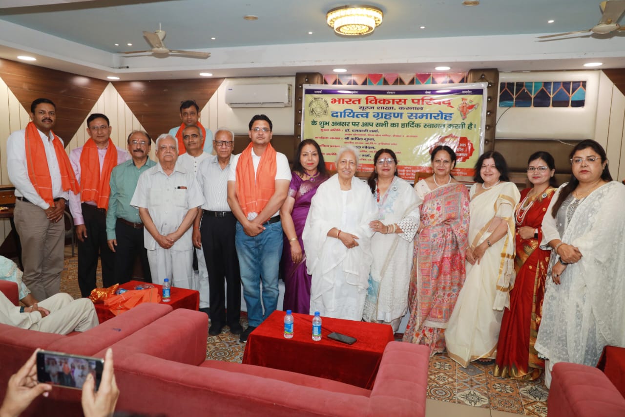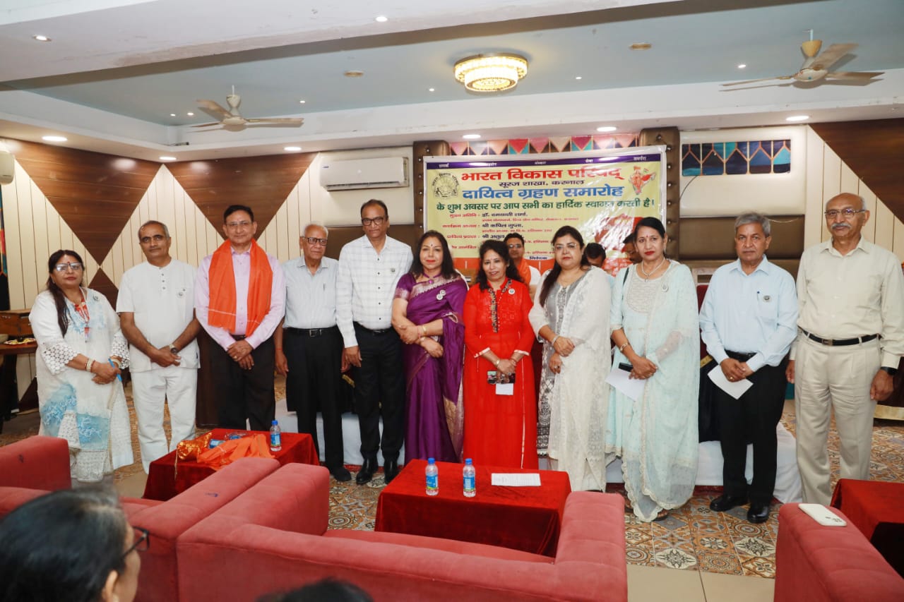 करनाल, 12 मई 2025: भारत विकास परिषद् सूरज शाखा करनाल की वर्ष 2025-2026 (संवत् 2082) की नई कार्यकारिणी का दायित्व ग्रहण समारोह 10 मई 2025 को करनाल क्लब में विधिवत रूप से संपन्न हुआ। कार्यक्रम में मुख्य अतिथि के रूप में सेक्टर-7, करनाल में स्थित दिव्य योग मंदिर की प्रधान योगाचार्या डॉ. दमयंती शर्मा ने अपना आशीर्वाद प्रदान किया। डॉ. शर्मा ने परम पूजनीय प्रभु स्वामी श्री देवी दयाल जी से योग शिक्षा प्राप्त की और लगभग 50 वर्षों से योग साधना व योगाभ्यास के माध्यम से प्राणीमात्र की सेवा में समर्पित हैं।